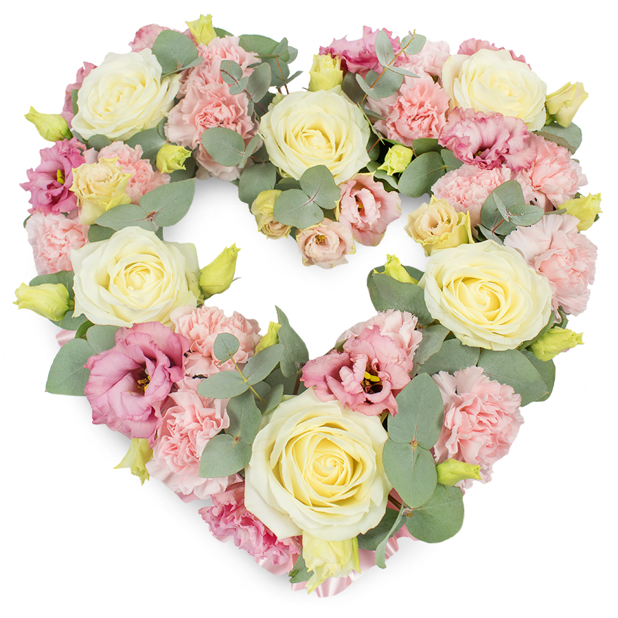 Convey your deepest emotions with our stunning heart tribute floral bouquet. Composed of elegant white roses, pink carnations, pink lisianthus, and fresh eucalyptus leaves, this arrangement is a perfect symbol of love and remembrance.